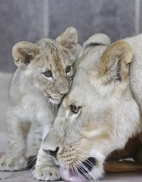 Львица облизывает одного из своих детёнышей в зоопарке в Эммене, Нидерланды, 26 апреля