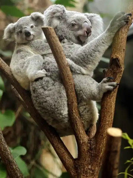 Детёныш коалы сидит на спине у своей матери в зоопарке в Дуйсбурге, Германия, 27 марта.