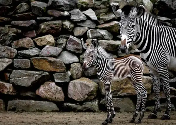 Зебра и её новорожденный детёныш стоят в своём вольере в Амстердамском зоопарке, Нидерланды, 19 февраля.