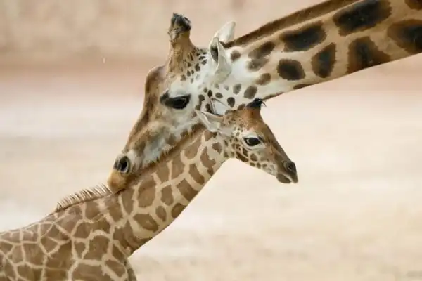 Самка жирафа Ротшильда обнюхивает своего детёныша в Ганноверском зоопарке в Германии, 7 мая.