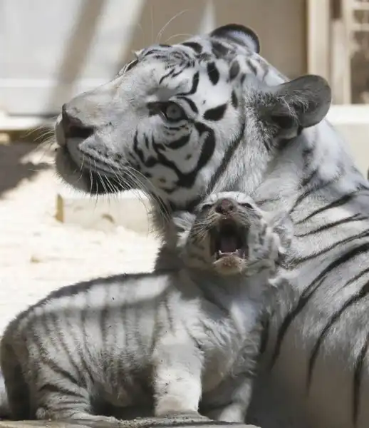 Самка белого тигра с одним из своих детёнышей в зоопарке Тобу в Токио, Япония, 2 мая.