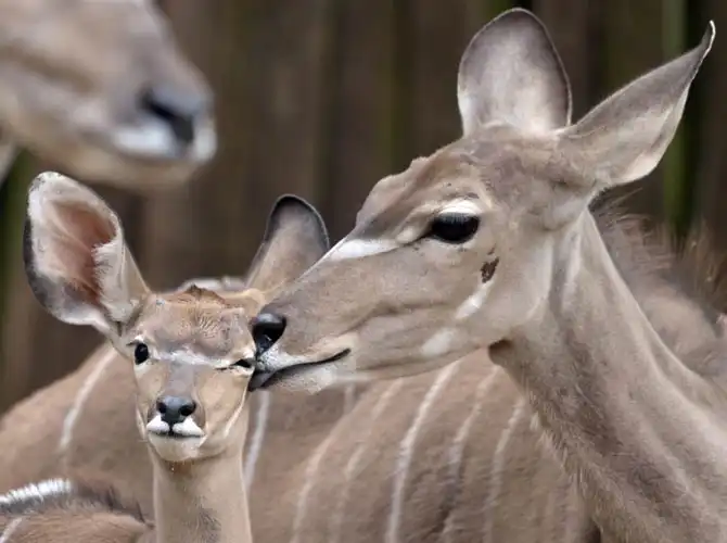 Куду облизывает своего детёныша в зоопарке в Дуйсбурге, Германия, 26 апреля. Куду – это вид антилоп.