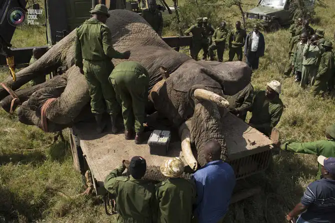Работники Службы охраны дикой природы Кении помещают усыплённого снотворным слона в кузов грузовика в рамках подготовки к предстоящему переселению десяти слонов, которые посягают на общинные земли, в заповеднике Ol Pejeta в центральной Кении.