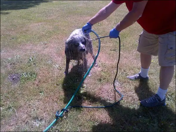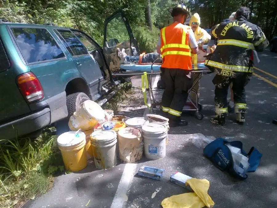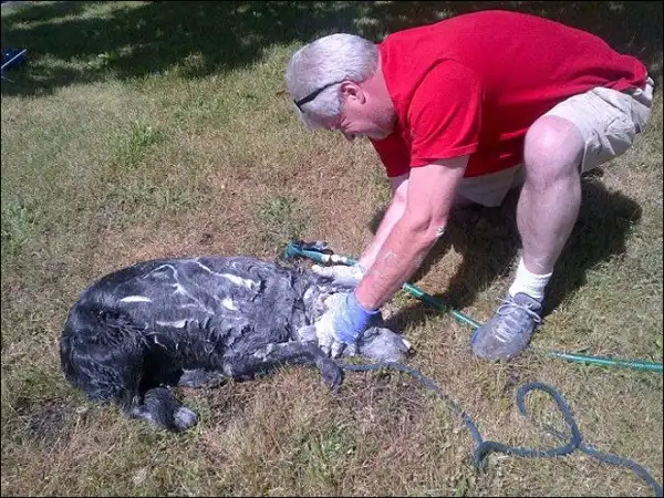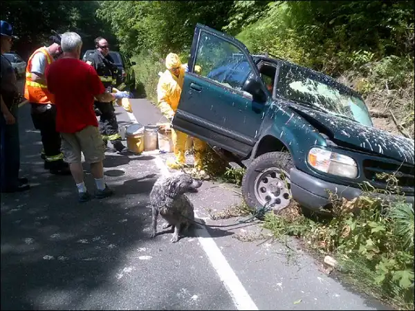 Ехал мужичок на своей машине вместе со своей собакой (будем звать его Шариком ). Нормально так ехали, даже отлично... пока что-то не привлекло собаку за окном, и Шарик как дурной начал лаять и прыгать по всей машине, видимо такими жестами он давал понять водителю о немедленной остановке. Очередной прыжок Шарика привел к потере управления автомобилем и последующим съездом с дороги. Всё бы ничего, но машина была загружена нехилым количеством краски (только что купленной в магазине). Прибывшие спасатели чуть не подохли от смеха, когда увидели водителя и падонга Шарега.