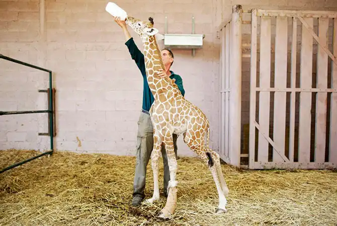 Жираф Дарвин родился в сафари-парке Израиля. Одна из его ног была повреждена еще в утробе матери, и после родов самка от него отказалась. Ветеринары сделали Дарвину бандаж, чтобы нога с врожденным увечьем была более устойчивой. На фото жирафенку всего восемь дней от роду.