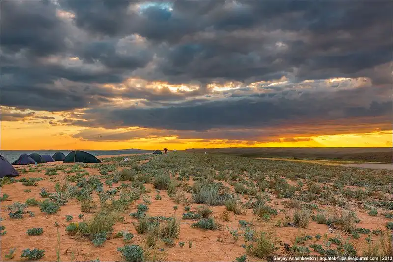 Кстати, одной из особенностей каракурта есть их сеть. В основном они плетут ее не вертикально, как большинство пауков, а горизонтально. И как я уже сказал выше - она хаотична и располагается в месте обитания Вдовы. Например, на фото берег моря неподалеку от Кояшского озера, в котором обитает просто огромное количество каракуртов. Среди этих редких кустарников, а также в кучах мусора, собранных ветром я находил повсеместно паутину и логово Вдов. Именно эти пауки послужили источником фотоматериала для этого поста.