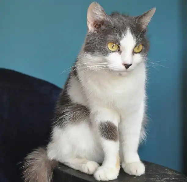 Красавице Катарине примерно 2 года, окрас голубой биколор, необычный голубой носик, зеленые глаза, как бы отведенные черным.
