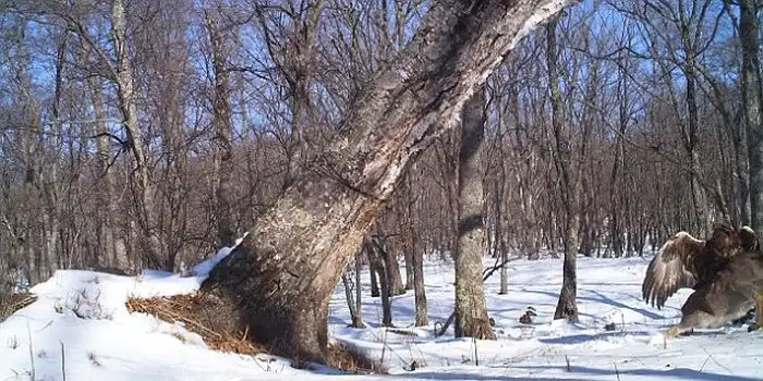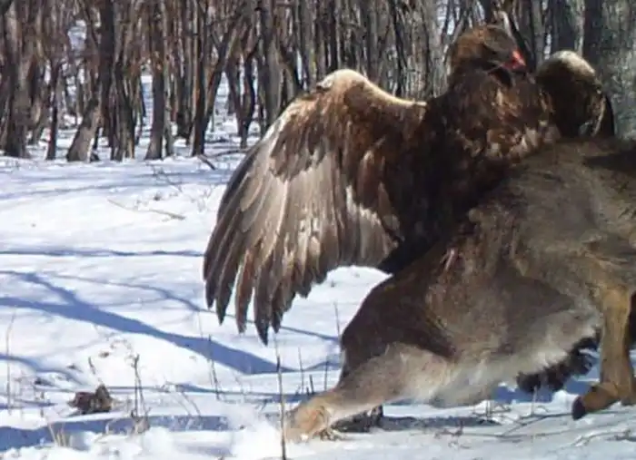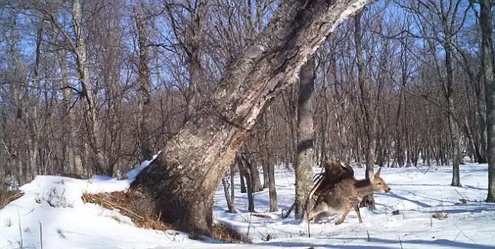 Эти уникальные кадры были сняты на территории Лазовского района, и они официально являются первым случаем подобного рода, который был зафиксирован на камеру. Мощная птица Беркут, которую также еще называют "Золотой орёл", настолько изголодалась, что напала на ничего не подозревающего пятнистого оленя. Хищная птица подняла в воздух свою добычу и унесла ее прочь, при том, что жертва была больше и тяжелее самого орла.