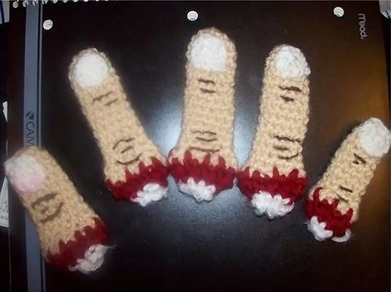. Связанные крючком «откусанные пальчики», наполненные кошачьей мятой. Действительно, учите кота стать убийцей с ранних лет.