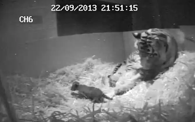 Кадр, заснятый камерой наблюдения, показывает первого тигренка, который родился в Лондонском зоопарке за последние 17 лет. После беременности, длившейся около 105 дней, пятилетняя суматранская тигрица Мелати родила одного тигренка. Должно пройти несколько недель, прежде чем Мелати будет готова показать миру тигренка пока неизвестного пола.
