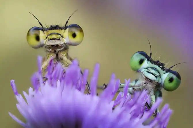 Фотограф Альберто Гицци Паницца, 38 лет, заметил этих ярко окрашенных стрекоз в росе, когда гулял по пойме реки рано утром. Пораженный их милыми позами, он заснял их, сидящими на цветке рано на рассвете. Мистер Паницца из Пальмы, Италия, сделал эту фотографию в долине реки По.
