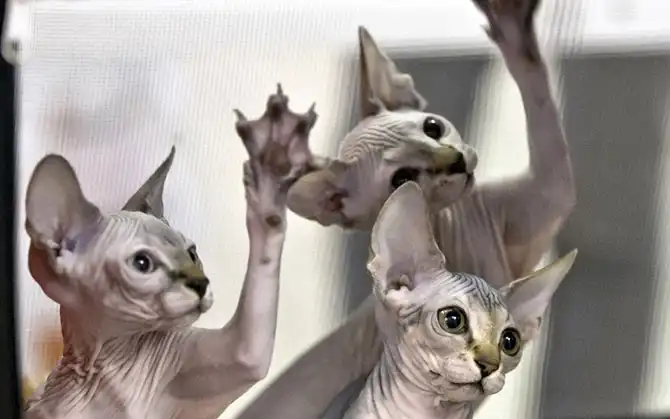 Котята-сфинксы тянутся к игрушке, предлагаемой им судьей, пока их оценивают во время международной выставки красоты кошачьих в Бухаресте, Румыния.
