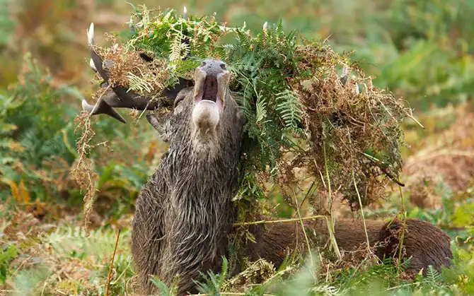 Этот олень доказывает, что он настоящий царь лесов с короной из листьев. Благородный олень пробрался через заросли папоротника в Ричмонд парке, неся на голове впечатляющий головной убор зеленого и коричневого цвета.