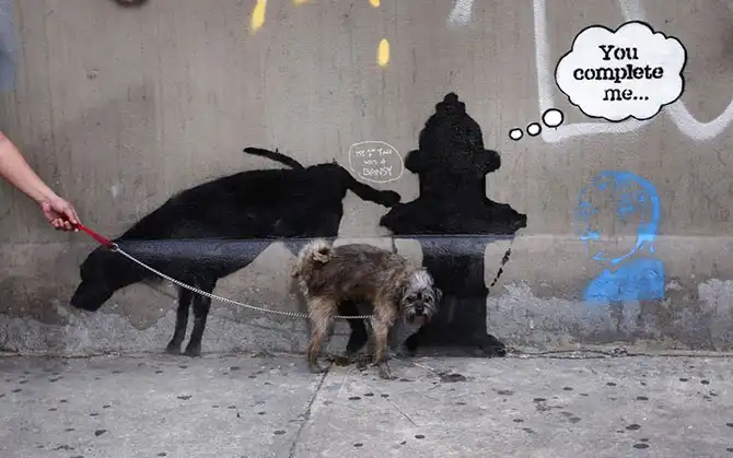 Собачка справляет нужду на новую работу граффити-художника Бански на 24 Западной улице Нью-Йорка. Три новых работы британского художника появились в Нью-Йорке за последнюю неделю, когда он приехал сюда пожить на месяц.