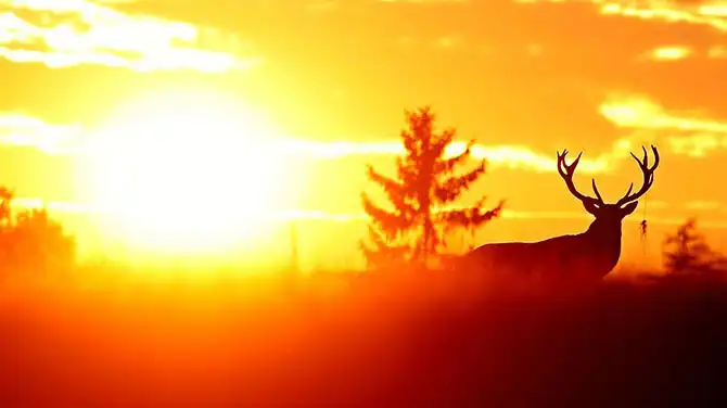 Благородный олень в утреннем тумане в парке Бревнице, Чешская республика. Осенью у них возникает половое возбуждение и начинается брачный период.