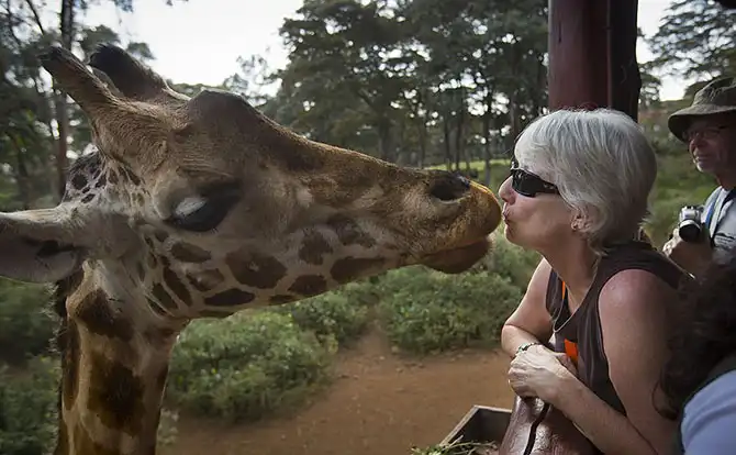 Жираф ест кусочек пищи изо рта иностранной посетительницы Центра жирафов в окрестностях Карен Найроби, Кения. Риск для туризма в стране был одной из главных проблем, обсуждаемых чиновниками в ходе первых дней сессии Westgate Mall, но туристы все же продолжают лететь в Кению на сафари и на пляжный отдых, несмотря на то несколько иностранцев были убиты во время атак на прошлой неделе.