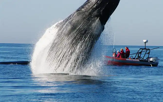 Горбатый кит Громмет выныривает из воды в знак благодарности команде спасателей китов, освободивших ее товарища Фогги, который застрял в старой ловушке для омаров в заливе Фанди, в двух милях от побережья Лонг-Айленд в Новой Шотландии, Канада.