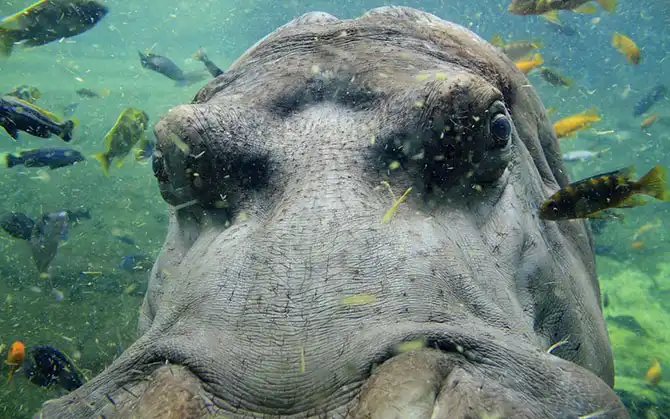 Гиппопотам вытаращился на фотографа из-за ограждения в зоопарке Сан Антонио в Техасе.