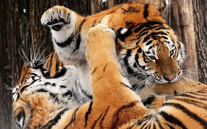 Сибирские тигры играют в зоопарке Двур Кралове, Чехия.