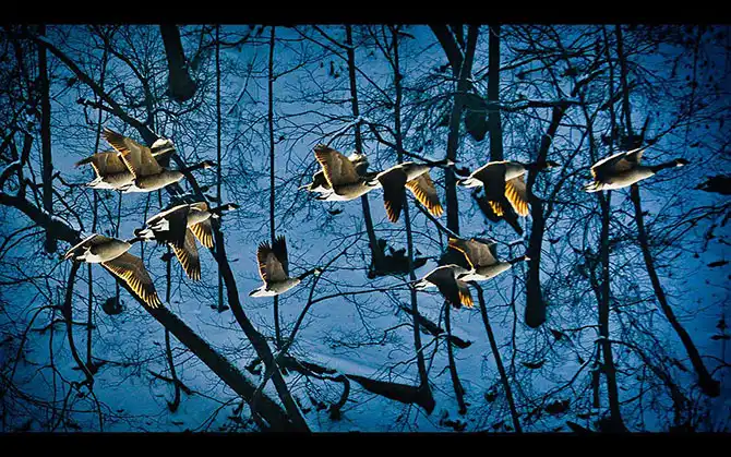 Стая канадских гусей летит над рекой Миссисипи в Миннеаполисе, США. Они собрались в стаю возле крохотного пятачка открытой воды на реке. Если погода хорошая, то много канадских гусей остается в Миннесоте на зиму, хотя большинство мигрируют на юг. По прогнозам Национальной службы погоды минусовая температура и морозные ветры сохранятся в Миннесоте до среды.