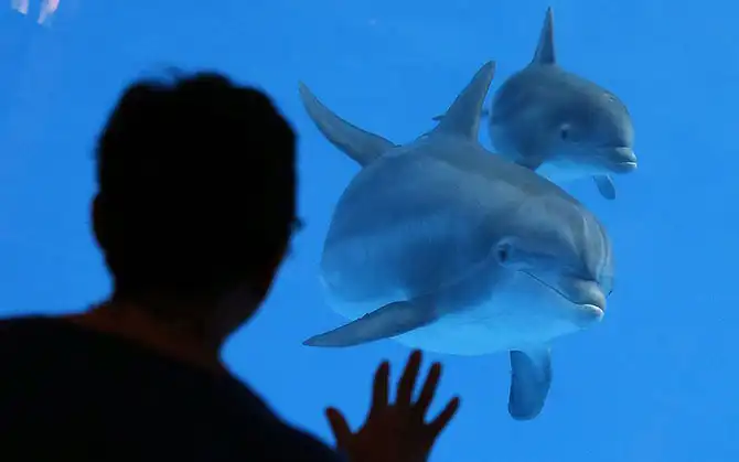 Женщина машет рукой Тапеко (по центру) и ее новорожденному самцу дельфина зоопарке Брукфилд в Чикаго, США. Дельфин, родившийся восемь недель назад, до сих пор пока без имени.
