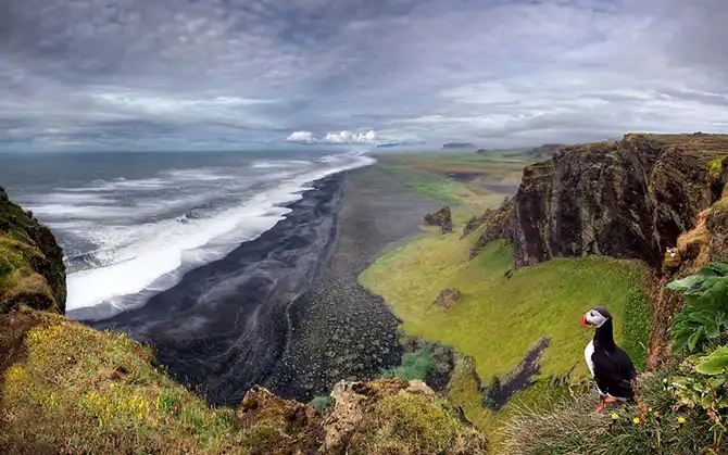 Одинокий тупик, живущий на краю скалы, смотрит на прибрежный ландшафт из своего гнезда с вершины скалы. Кристиан Швайгер, 42 года, сфотографировал его с расстояния в несколько футов на вулканическом полуострове Дирхоулаэй, на юге Исландии. Он рассказывает: тупики были заняты своей добычей в отверстиях гнезд в траве на верхнем краю скалы.