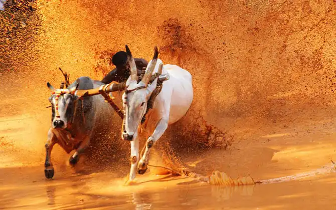 Участник гонки на волах, которые проводились на рисовом поле в Малаппурам, кусает хвост одному из своих быков, чтобы он бежал быстрее.