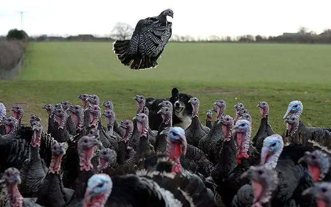 Овчарка Отто сгоняет стаю бронзовых индеек, свободно выгуливаемых для органического разведения на ферме Хук Хауз в Кирби Флизам.