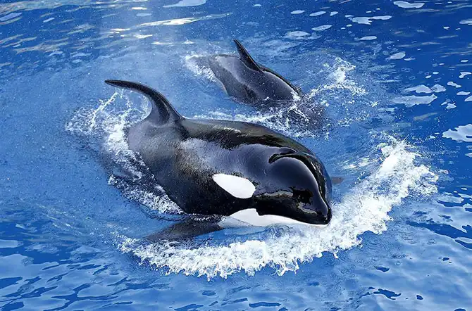 Семья косаток в парке в городе Антиб на Лазурном берегу. Это могучие животные, самцы достигают в длину 9—10 м при массе до 7,5 тонн.