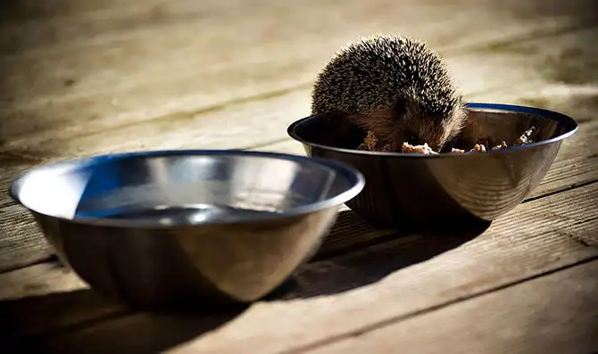 Ежик пробует корм для собак, Ленгенфельд, Германия.
