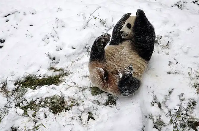 Большая банда радуется снегу в городском округе Куньмин, Китай. Впервые большая панда стала известна на Западе в 1869 году благодаря французскому миссионеру Арманду Давиду (1826—1900). Большие панды вскоре стали любимцами публики благодаря их схожести с плюшевыми медведями. Кстати, геномы человека и панды совпадают на 68 %.