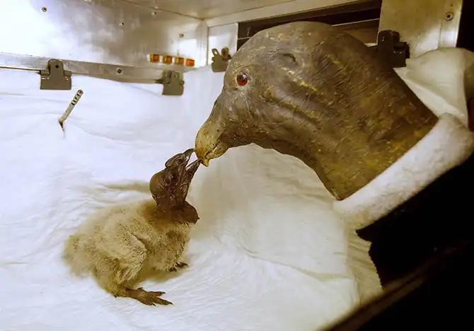 Маленький андский кондор общается со своим собратом-марионеткой в зоопарке Буэнос-Айреса. Здесь разводят птенцов и затем выпускают через 3 года в их естественную среду обитания. По мнению ученых, такое общение маленьких птиц с куклой поможет предотвратить привыкание к людям.