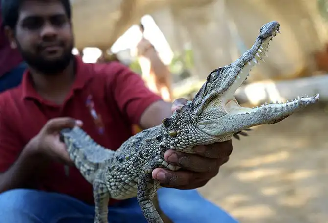 Новорожденный крокодил в Центре дикой природы в Карачи. Его длина составляет 8,6 см и весит около 60 гр.