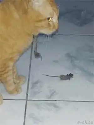 Кот поймал мыша, и, как водится, решил перед ужином поиграть с ним. Но у мышки были другие планы — она притворилась трупом и, как только рыжий отвлекся, дала деру. Если бы вручали Оскар за лучшую роль трупа, мыша стала бы явным фаворитом.