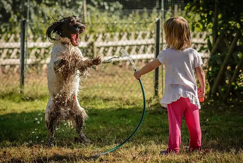 Мэтт Оделл определен в общие победители со своей фотографией английского спрингер-спаниель Декстера, резвящегося на задних лапах, во время его купания его маленькой владелицей Люси, 3 года. Собачье купание было сфотографировано отцом Люси, Мэттом, который схватил свою камеру, когда он увидел, как два лучших друга играют вместе. "Это был действительно жаркий день, и им было очень весело, Декстер очень любит воду", сказал Мэтт, из Девона. "Мы приобрели Декстера пару лет назад, и он очень озорной, но прекрасно ладит со всей семьей. Это был прекрасный момент"