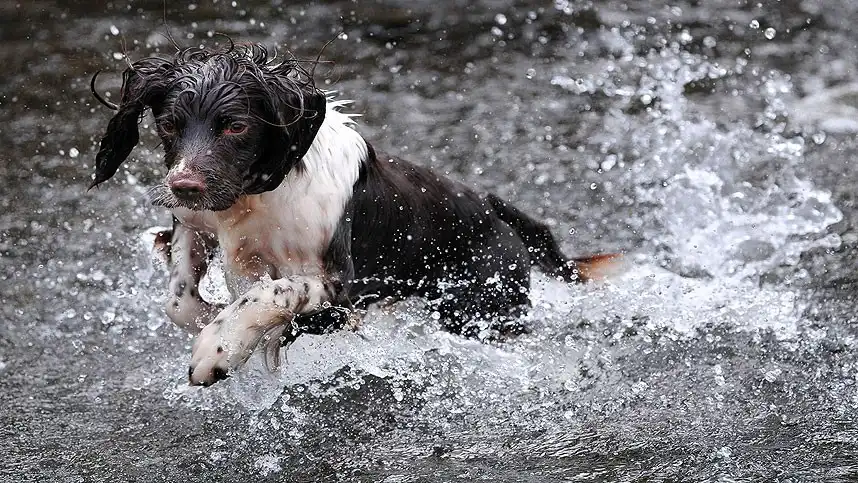 Работа Мартина Крукстона, Плещущаяся Собака, на ней изображен спаниель Спенсер, прыгающий в потоке в Пембридж, Херефордшир.