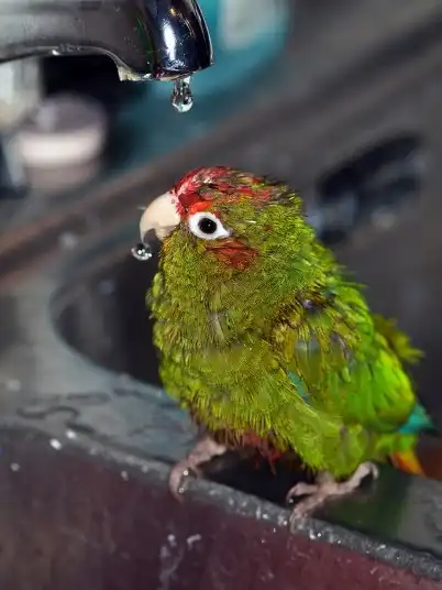 Это фото красноголового краснохвостого попугая, Чили, "отбивающего чечетку" в кухонной раковине было отправлено Александрии де Таранто, которая рассказывает, что Чили любит бегать взад и вперед под краном, пытаясь поймать капли, а, если вы начнете мыть посуду он будет пытаться прыгать в миске!