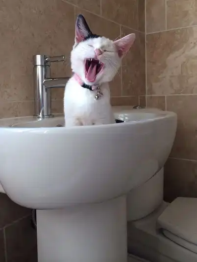 Четырех месячный кот Oreo Донны Витворта зевает в умывальнике.