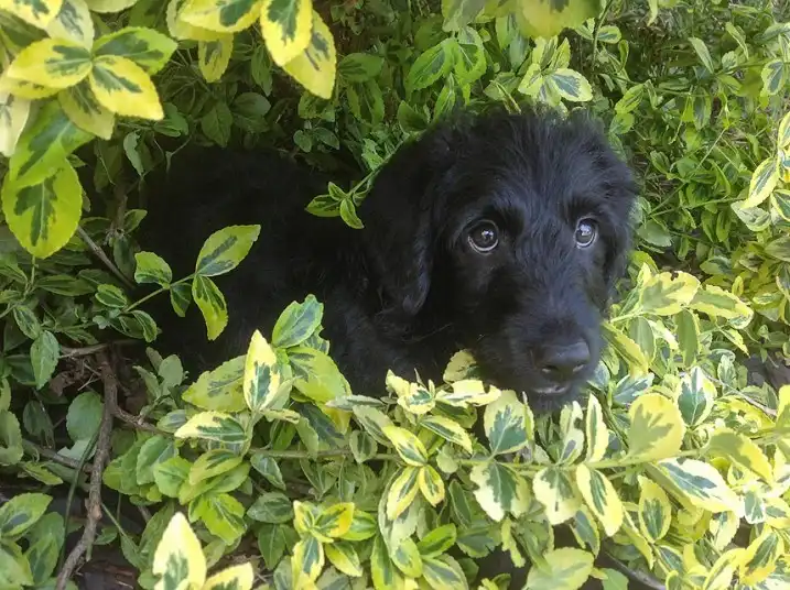 Владелец Алекс Эванс говорит: Мой лабрадудль щенок Бринли любит залазить в небольшое отверстие, которое он сделал в одном из наших кустарников в саду. Он складывает там свои вещи, которые собирает палки, растения, бутылки с водой, горшки и многое другое, а мы не можем туда добраться, чтобы забрать. Но мы все равно его очень безумно любим, несмотря на его шалости.