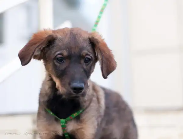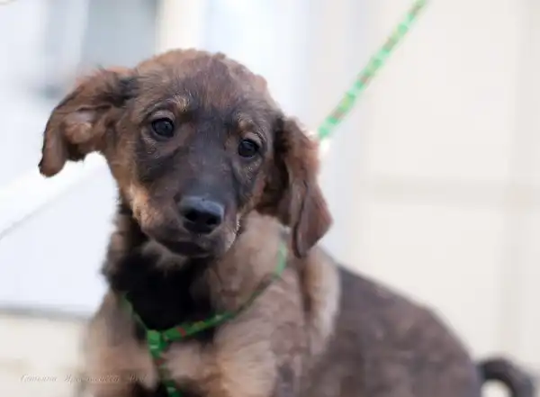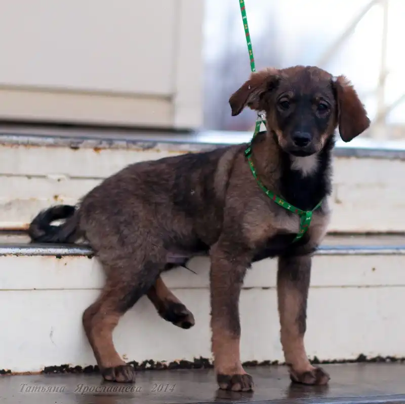 Щенок, мальчик, возраст около 3 мес. Родился от бездомной собаки на базе. Очень веселый, задорный, позитивный малыш, хорошо ходит на поводке. Вырастет среднего размера.
