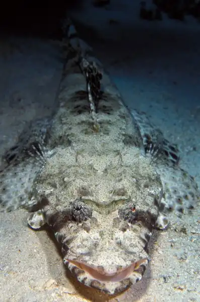 Рыбы-крокодилы ведут малоактивный образ жизни, предпочитая весь день пролежать на пузе, зарывшись в песок, ожидая неосторожную добычу.