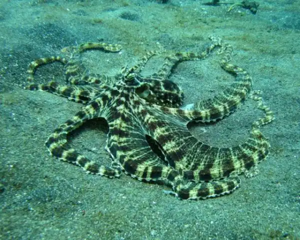 Thaumoctopus mimicus - это разновидность осьминогов, впервые обнаруженная в конце 1990-х вокруг Индонезии и Большого Барьерного рифа. Многие осьминоги умеют менять цвет и структуру кожи, но только этот вид умеет копировать поведение и внешний облик других обитателей: скатов, морских змей, медуз и других. В течение нескольких секунд Thaumoctopus mimicus способен превратиться во многих морских существ - эта поразительная способность охраняет его от хищников.