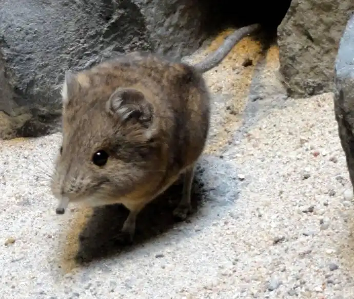Нос у зверька довольно сильно вытянут и напоминает хобот, за что попрыгунчик и был назван слоновым. А почему, собственно, прыгунчик? Тут все очень просто. Это местное название, придуманное аборигенами задолго до появления бледнолицых зоологов. Дело в том, что задние лапки зверька намного длиннее передних и когда ему угрожает опасность, он встает на эти лапки и запросто упрыгивает куда подальше, как миниатюрный кенгуру.