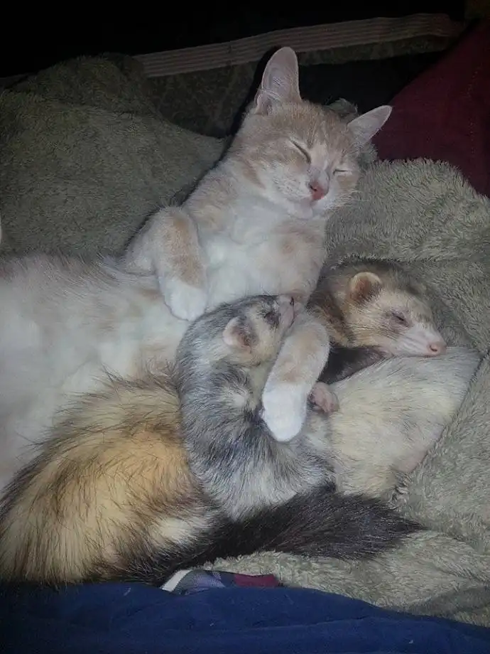 Ребята вместе играют, едят и спят. Но самое трогательное зрелище - это когда Нед умывает хорьков. Межвидовая и межродовая дружба у животных - явление редкое. Но рыжий котенок и два его товарища ломают все стереотипы.