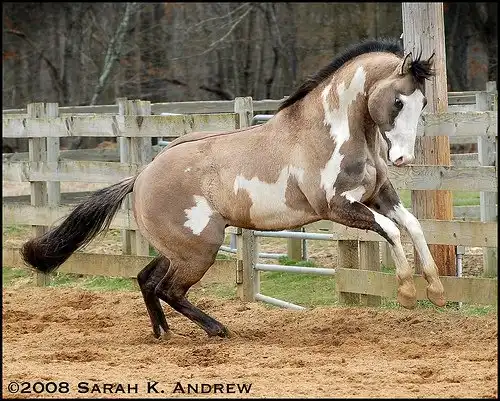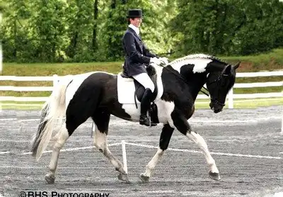 Лошадь породы пинто сочетает в себе белый и любой другой однотонный цвет. Комбинации цветов могут быть самыми разнообразными. На фото: чёрно-белый пинто.