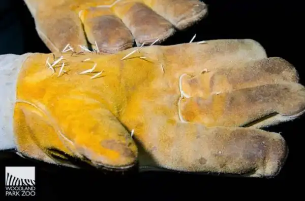 Маленькие дикобразы рождаются с очень мягкими иглами, которые твердеют уже через пару часов. Поэтому сотрудникам зоопарка для осмотра и подкормки детеныша приходится надевать толстые перчатки.