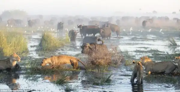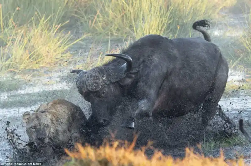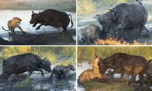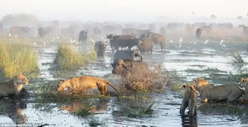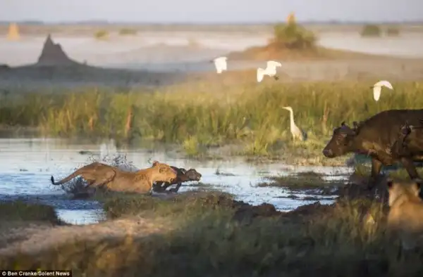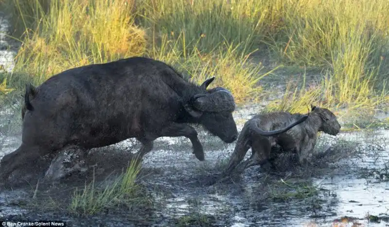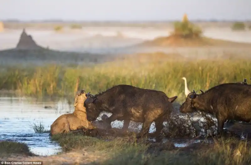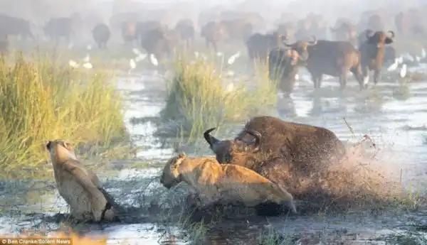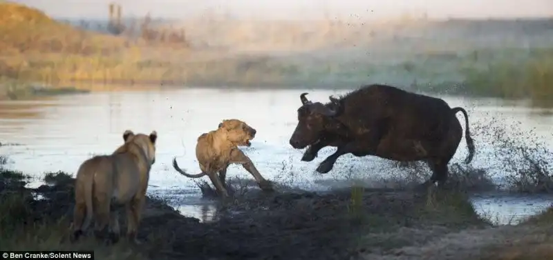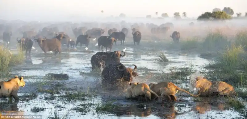 Фотограф Ben Cranke снял эти драматические кадры в болотах Окаванго в Ботсване, Южной Африке. Прайд львов напал на теленка, но мать бросилась на его защиту, к ней подключились еще и другие буйволы и не плохо наваляли львам, теленок не пострадал.