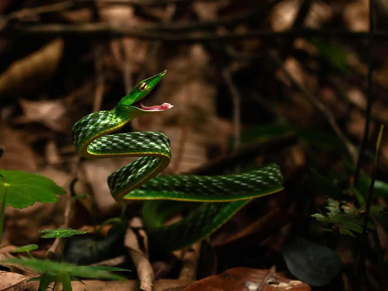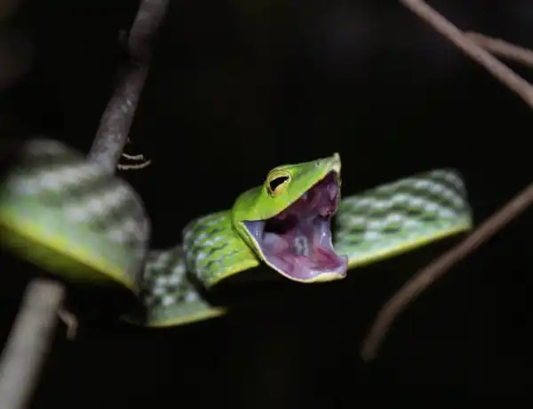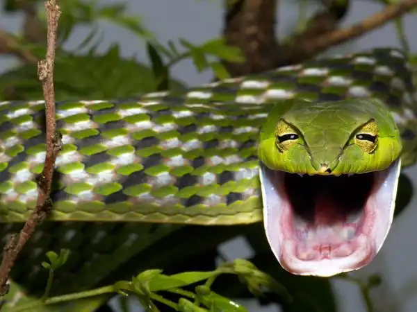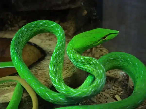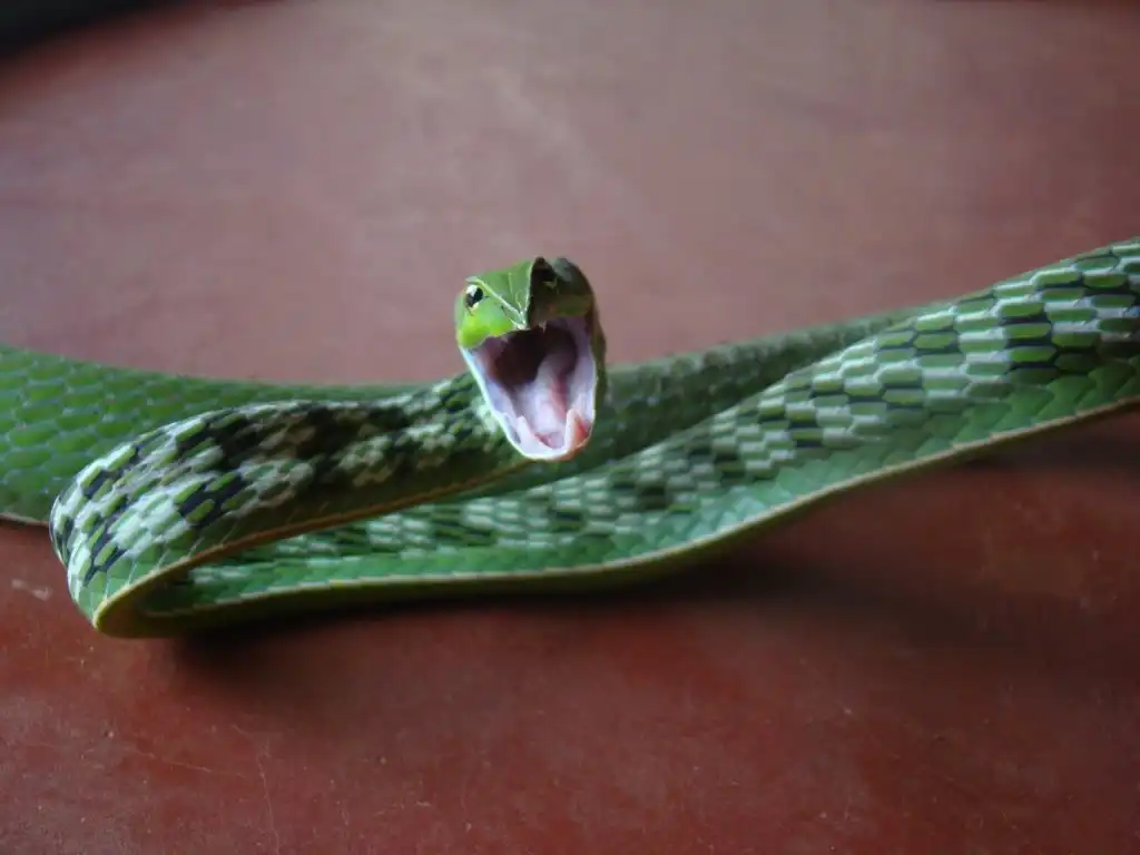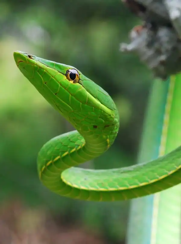Травянисто-зеленая плетевидная змея.