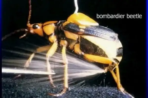 «Эта защитная жидкость жука бомбардира (латинское название жука — Stenaptinus insignis) выпрыскивается очень быстрыми импульсами (приблизительно 500 выстрелов в секунду), а не просто непрекращающимся потоком… Система выпрыскивания жука, демонстрирует общую схожесть с пульсирующим воздушно-реактивным механизмом немецкой «жужжащей» бомбы под кодовым название V-1, используемой во времена Второй Мировой Войны. Брюшной кончик действует в роли вращающейся орудийной установки, которая позволяет жуку направлять поток жидкости во всех направлениях.… Здесь мы сообщаем о том, что спрэй выпускается жуком не как непрерывный поток, но как пульсирующая струя, по аналогии с системами доставки жидкости, известными из технологий, но не из гланд животных (1990, 248:1219).»