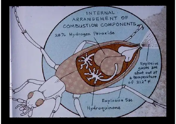 «Защитная система жука необычайно сложна – что-то вроде гибрида слезоточивого газа и автомата Томпсона. Когда жук ощущает опасность, он сразу же смешивает внутри ферменты, содержащиеся в одной из его камер, с растворами химических соединений, перекиси водорода и гидрохинона, находящиеся в другой камере. Результат этой химической реакции — ядовитая смесь едкого бензохинона, которая кипящей струей вылетает из жука при температуре 212 градусов по Фаренгейту. Более того, смесь качается через двойные форсунки, вращающиеся наподобие механизма в винтовке В-17, поражая голодного муравья или лягушку с невероятной точностью».